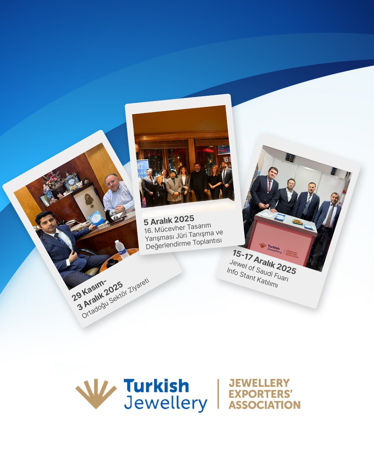 15-17 Aralık 2025: Mücevher İhracatçıları Birliği, Jewel of Saudi Fuarı'nda info stand ile yer aldı. Cidde Başkonsolosumuz Sn. Mustafa Ünal ve Ataşemiz Oğuz Şahin standı ve katılımcıları ziyaret ederek istişarelerde bulundu.
