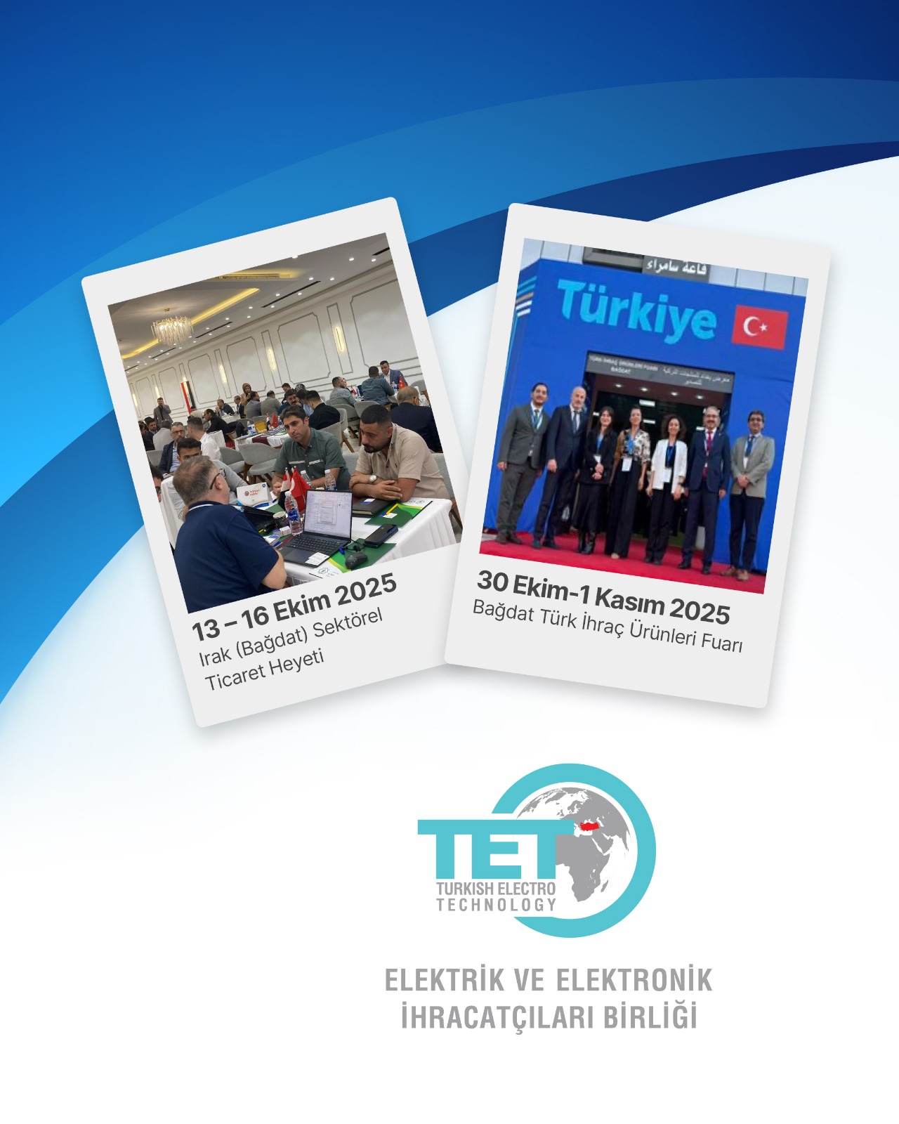 13 – 16 Ekim 2025: Elektrik ve Elektronik İhracatçıları Birliği (TET) tarafından, Irak'ın Bağdat şehrinde Sektörel Ticaret Heyeti düzenlendi. Organizasyonda 16 firmadan 22 temsilci yer alırken, 247 ikili iş görüşmesi (B2B) gerçekleştirilmiştir. Gerçekleştirilen ikili iş görüşmeleri sayesinde yeni iş fırsatları doğmuş ve katılımcıların uluslararası ticaret ağlarını genişletmeleri sağlanmıştır.