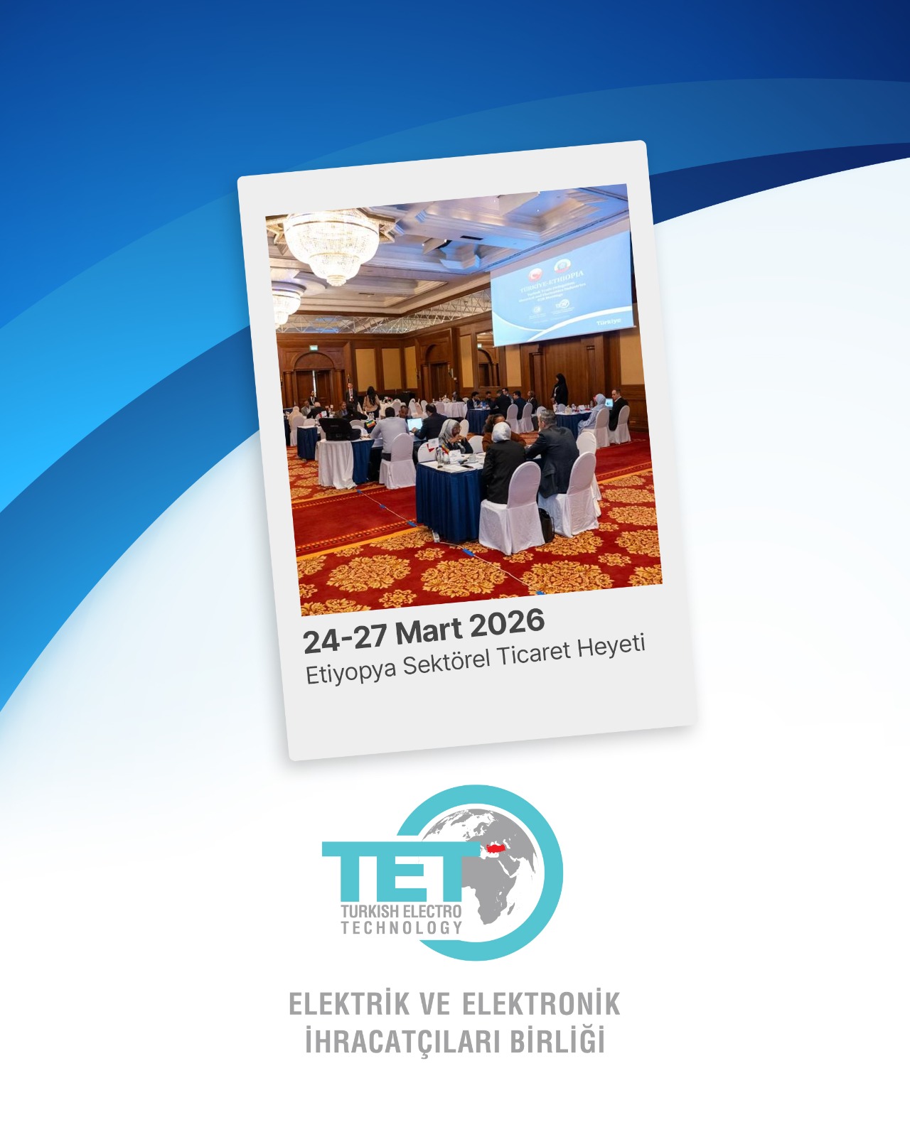 24-27 Mart 2026: EEİB organizasyonunda 11 firmanın katılımı ile Etiyopya'nın Addis Ababa şehrine bir Sektörel Ticaret Heyeti düzenlendi. Program kapsamında düzenlenen B2B etkinliği çerçevesinde katılımcı firmalarımız Etiyopyalı muhatapları ile 210 ikili iş görüşmesi gerçekleştirerek; ürün ve firma portföylerini tanıtma fırsatı yakaladı. Heyetin ikinci günün firmalarımız bireysel firma ve pazar ziyaretlerini gerçekleştirdi.