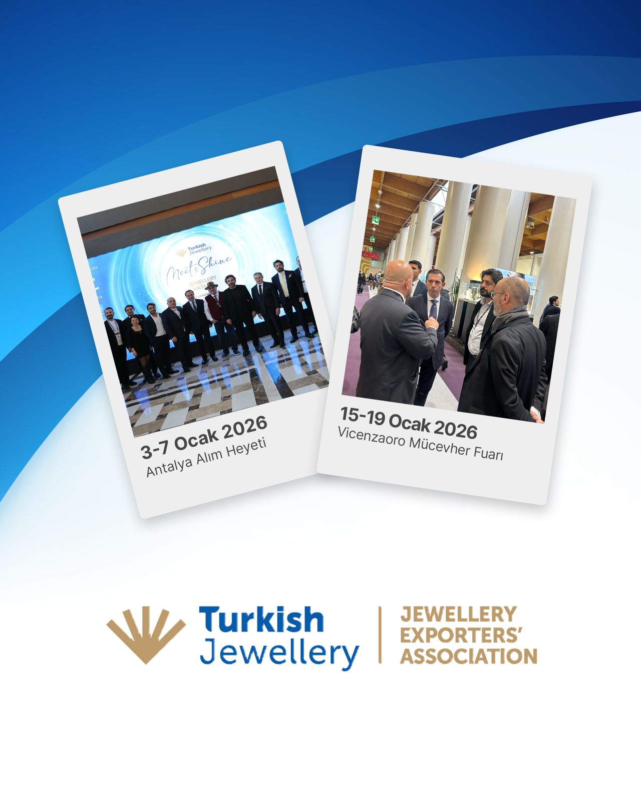 15-19 Ocak 2026: 100+ Türk mücevher firmasının katıldığı İtalya'nın Vicenza şehrinde düzenlenen Vicenzaoro Fuarına Mücevher İhracatçıları Birliği Başkan Yardımcısı Murad Köşker ile Mücevher Sektör Şube Müdürü Şirzat Akbulak fuar ziyareti gerçekleştirdi.
