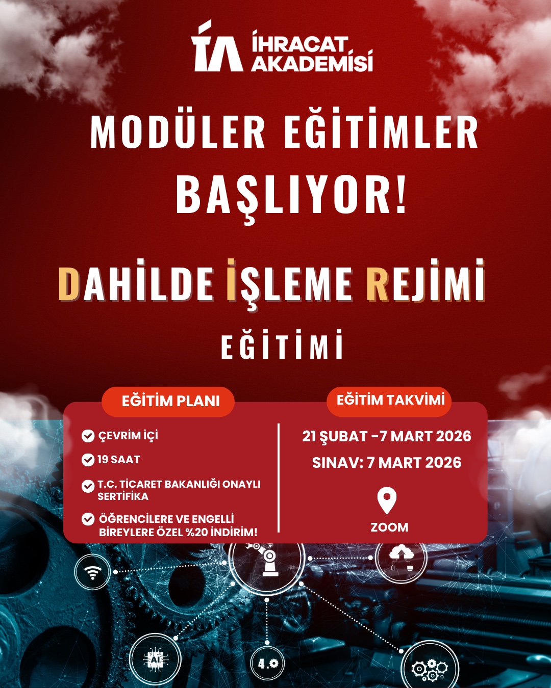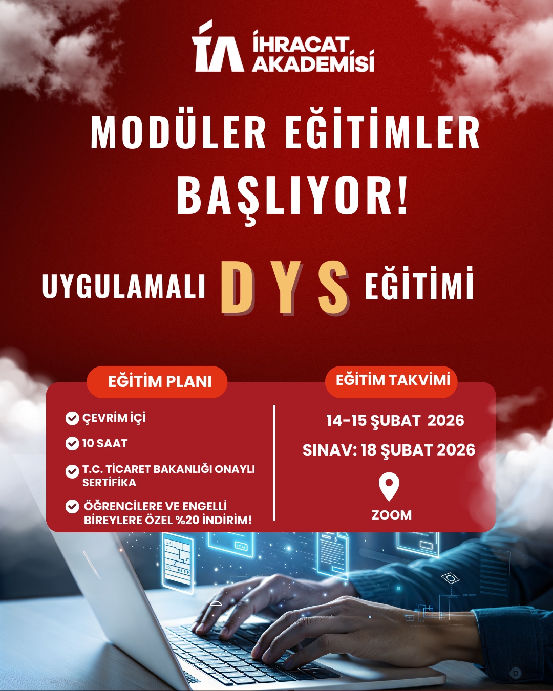 T.C. Ticaret Bakanlığından alınan bir yazıda, İhracat Akademisi bünyesinde 14-15 Şubat 2026 tarihlerinde çevrim içi Destek Yönetim Sistemi (DYS) Eğitim Programı ve 21 Şubat-7 Mart 2026 tarihleri arasında çevrim içi Dahilde İşleme Rejimi (DİR) Eğitim Programı gerçekleştirileceği bildirilmektedir. Eğitim programlarının sonunda; 18 Şubat 2026 tarihinde DYS Eğitim Programı sınavının, 7 Mart 2026 tarihinde ise DİR Eğitim Programı sınavının, çevrim içi ve çoktan seçmeli olarak gerçekleştirileceği belirtilmekte olup, katılımcılara Ticaret Bakanlığı onaylı Katılım/Başarı Belgesi verileceği ifade edilmektedir.